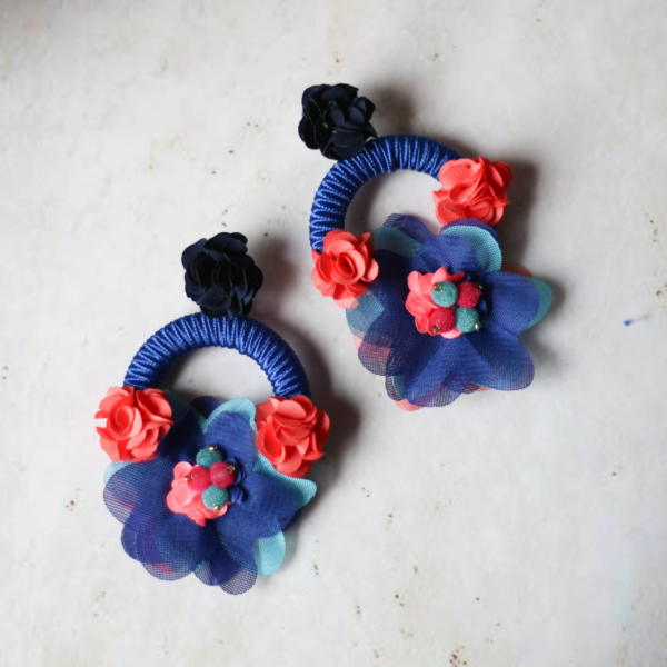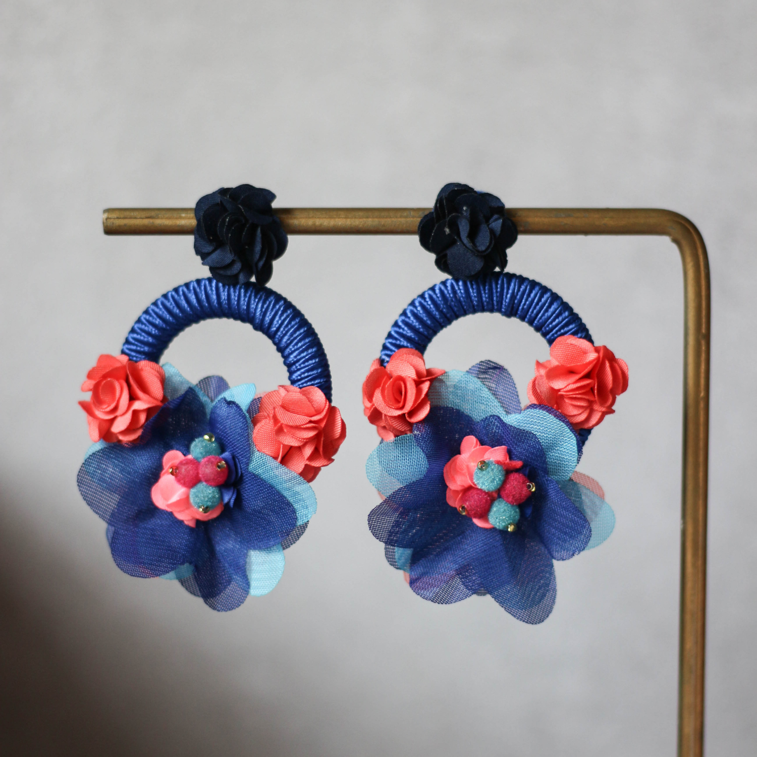 Los Aretes Anabelle en tonos azul intenso son una explosión de color y textura. Están elaborados con flores textiles en capas superpuestas, mostacillas en el centro y una base circular forrada a mano, creando una pieza llamativa y única.