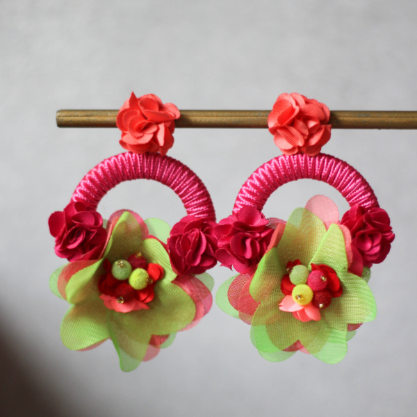 Los Aretes Anabelle en tonos rosado y verde son una explosión de color y textura. Están elaborados con flores textiles en capas superpuestas, mostacillas en el centro y una base circular forrada a mano, creando una pieza llamativa y única.