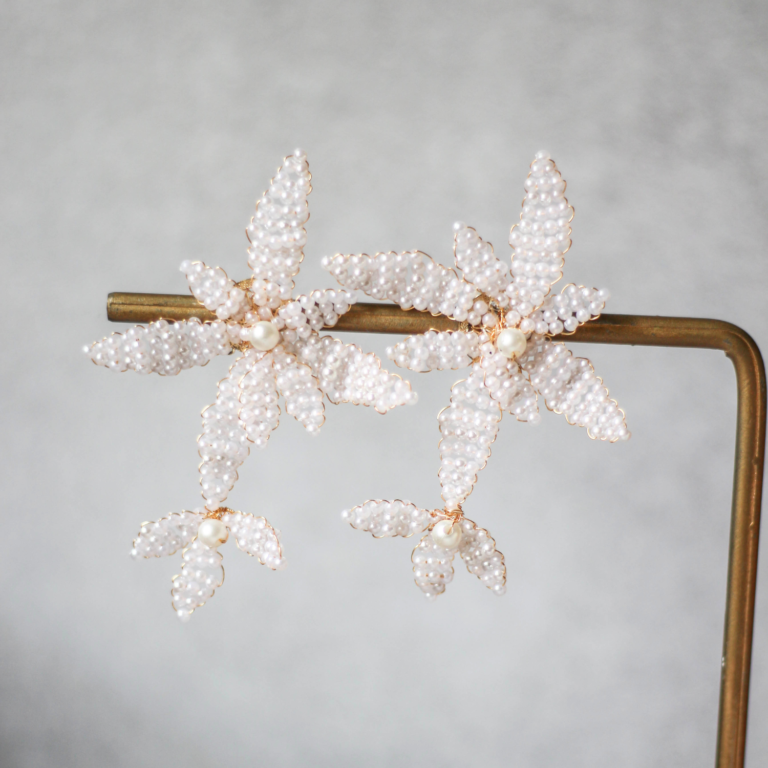 A pesar de su tamaño llamativo, son increíblemente livianos y cómodos de llevar, ideales para eventos, bodas o para elevar un look elegante sin sobrecargarlo. Las flores están formadas con mostacillas tipo perla cosidas una a una, creando una joya que evoca naturalidad, glamour y atención al detalle.